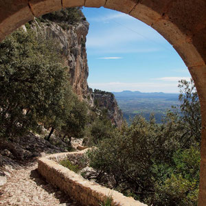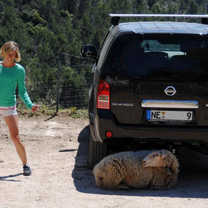 Hoch, runter, links, rechts…flizzen wir die Serpentinen bis zu unserem Ziel mit unserem Pathfinder entlang. Am Dorf Alaro (nordwestlich von Palma am landseitigen Fuße der Serra de Tramuntana) vorbei geht’s ab in die Berge! Am Fuß des Berges angekommen wird unser Gefährt erst einmal sicher platziert und findet auch sofort von dem einen oder anderen Schäflein Zuneigung…ein dickes Schaf genießt den Schatten, den der Pathfinder spendet…Klar, warum nicht!